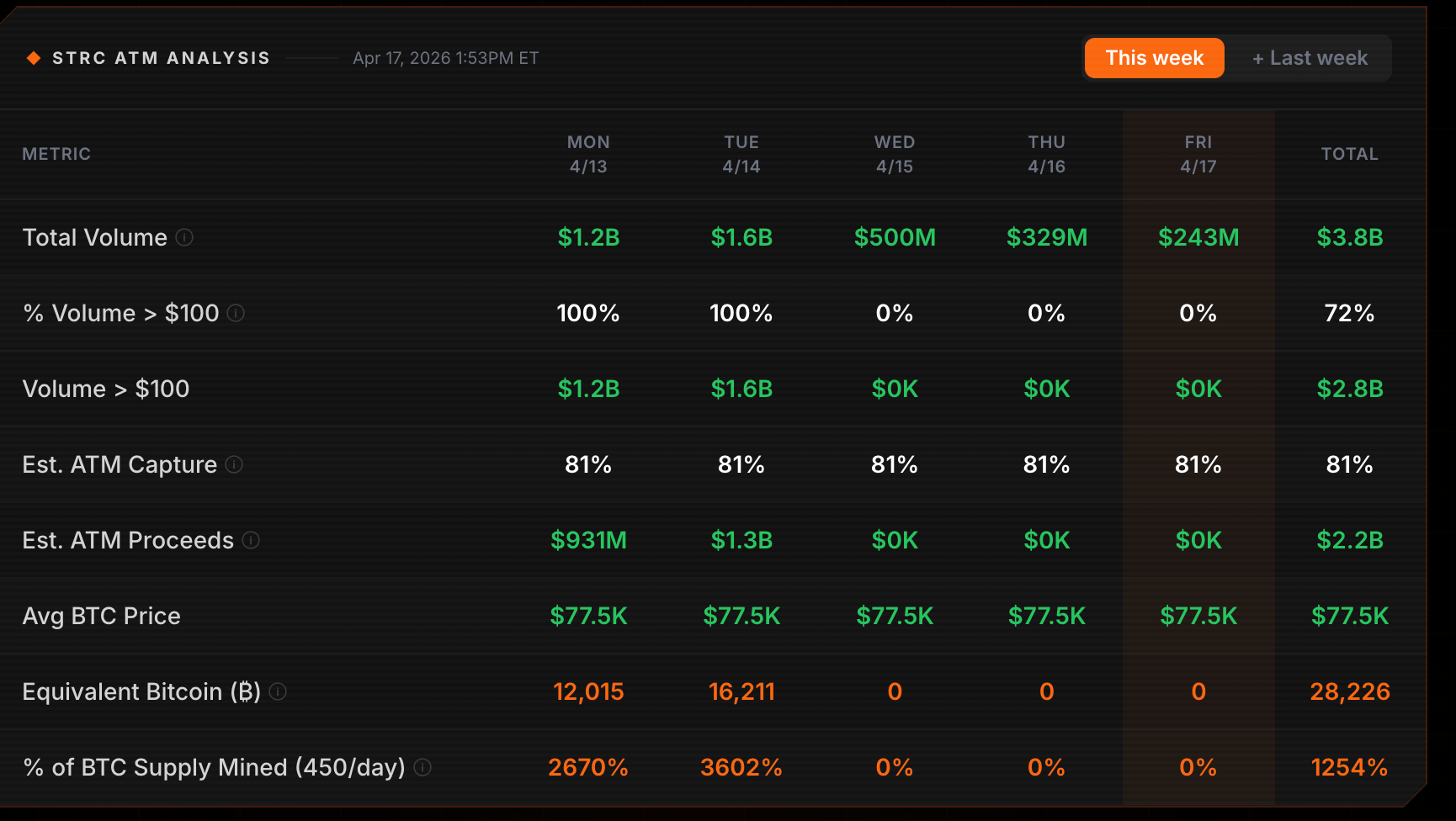 Strategy's STRC vehicle raised ~$4 billion in total volume this week, with $2.2 billion in estimated ATM proceeds concentrated entirely in the first two days. Monday and Tuesday alone saw STRC absorb the equivalent of 28,226 BTC, at an average price of $77,500.