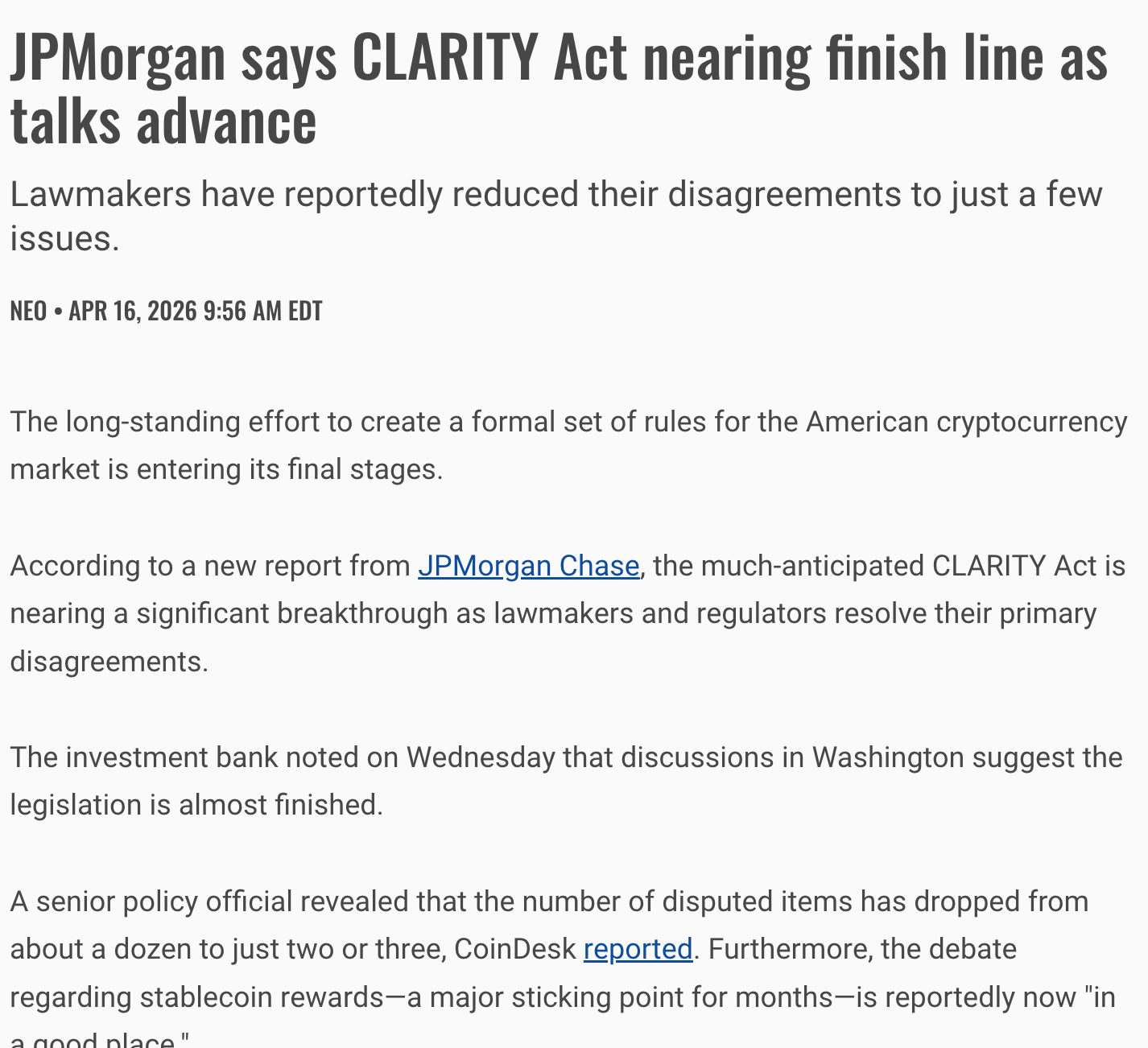 JPMorgan Chase reported this week that the CLARITY Act — the long-awaited legislation to establish formal rules for the American crypto market, is down to its last two or three disputed items. A senior policy official confirmed the number of disagreements dropped from roughly a dozen. The stablecoin rewards debate, a sticking point for months, is reportedly resolved.