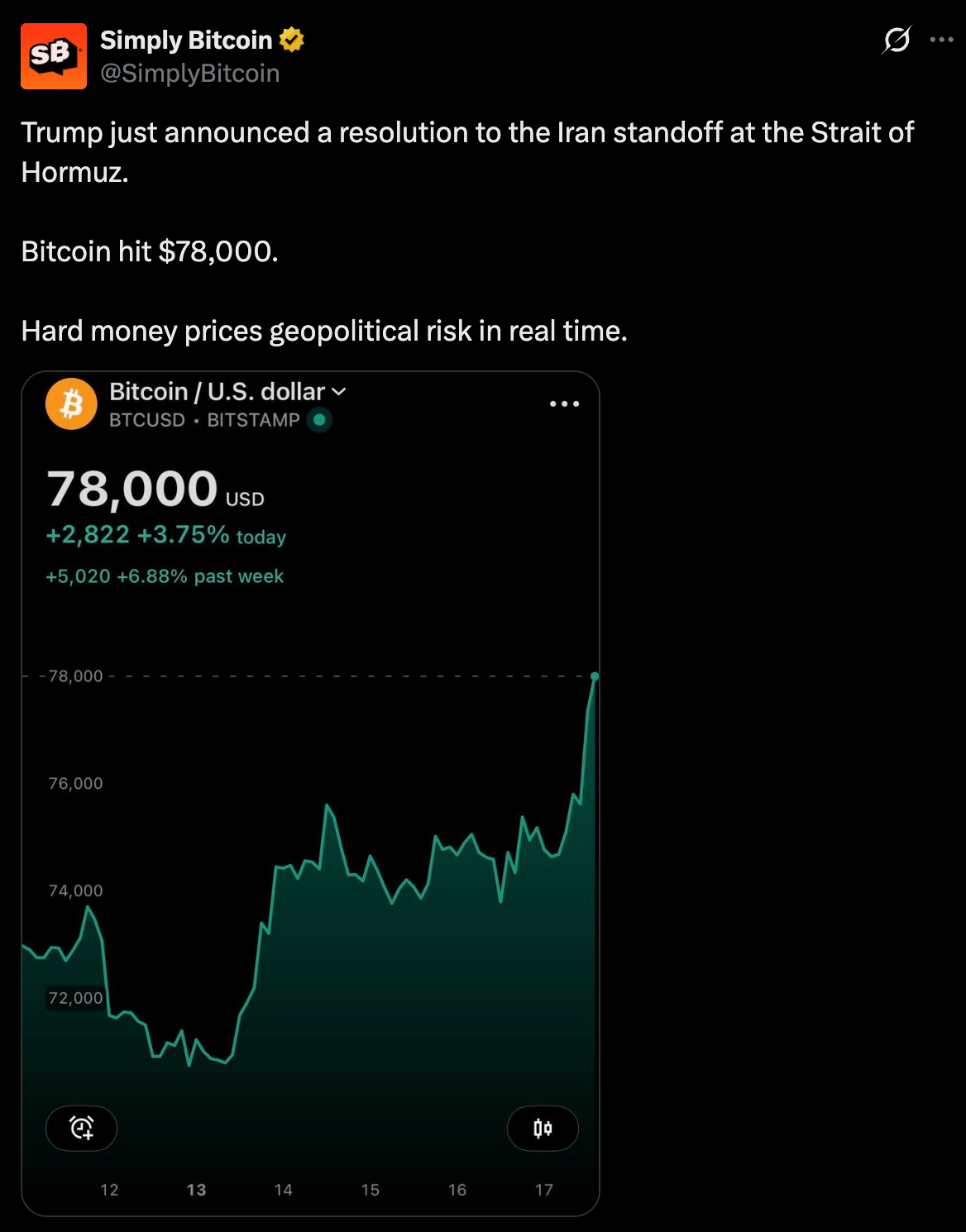 Bitcoin was sitting in the low $70,000s when Trump announced a resolution to the Iran standoff at the Strait of Hormuz. Within hours, it had cleared $78,000, a three-week high, up 6.88% on the week.