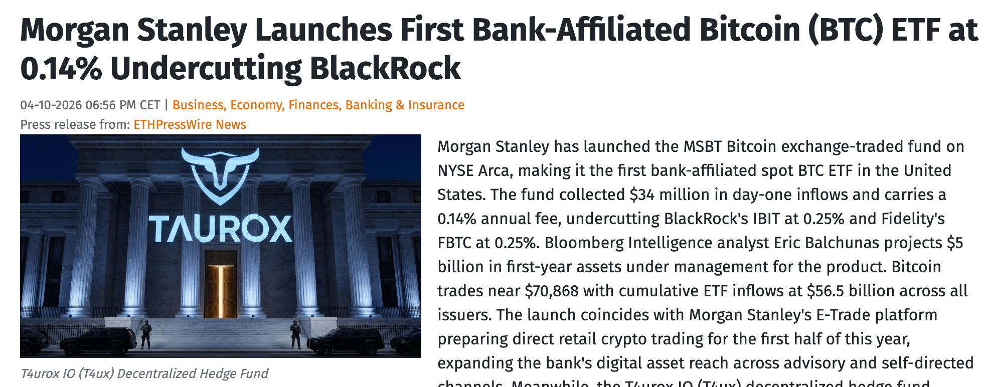 Morgan Stanley listed MSBT on NYSE Arca this week, making it the first spot Bitcoin ETF launched by a bank in the United States. The fund pulled $34 million in day-one inflows and priced its annual fee at 0.14%, below BlackRock's IBIT at 0.25% and Fidelity's FBTC at 0.25%.