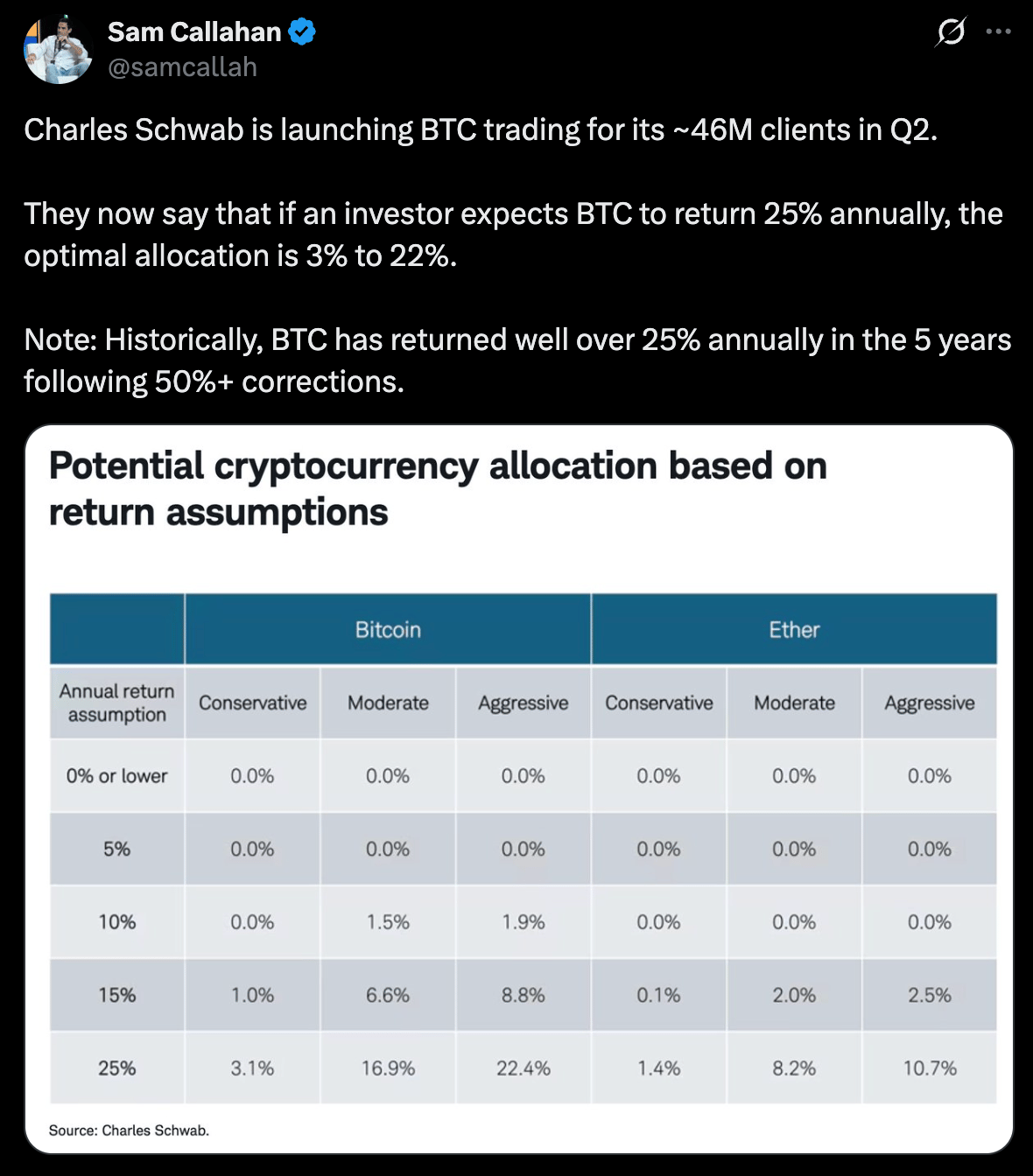 Charles Schwab is launching spot Bitcoin trading for its approximately 46 million clients in Q2. Alongside that announcement, the firm published its recommended portfolio allocation framework.