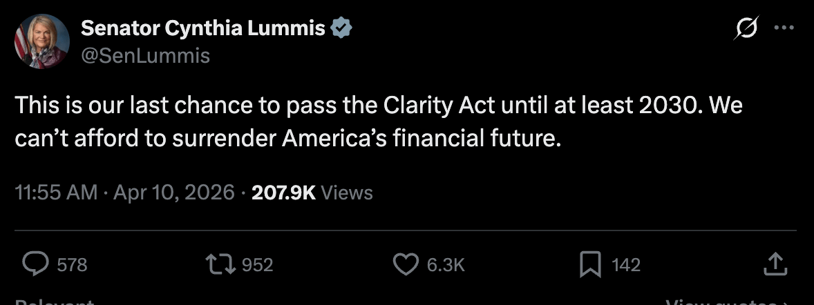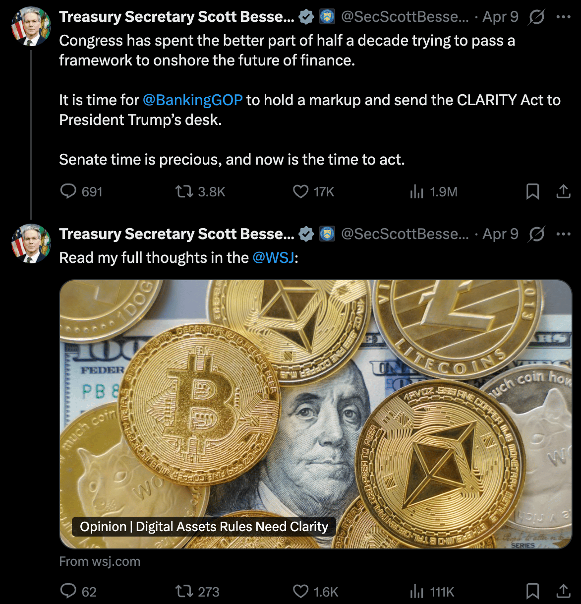 His post pulled 3,800 retweets and 1.9 million views. The message was not diplomatic. Congress has spent the better part of half a decade debating a digital asset framework. Bessent's position is that the window is open and closing. Miss it and the next realistic opportunity is 2030.