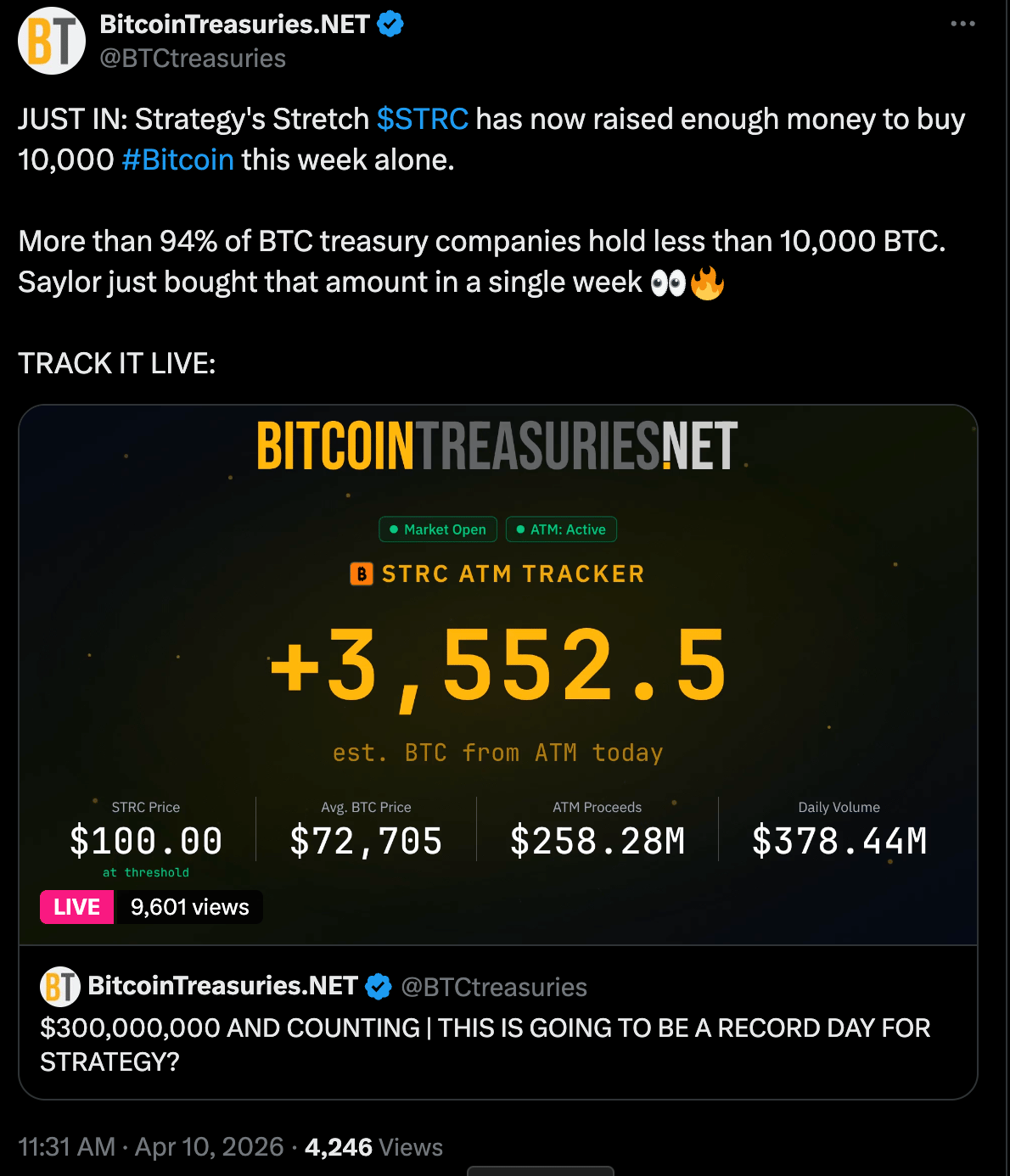 🟠 STRC Raised Enough to Buy 10,000 Bitcoin in One Week